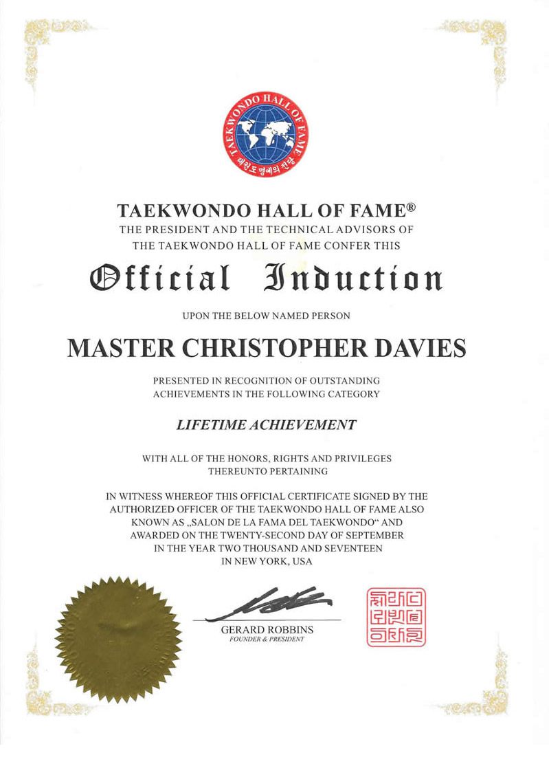 In 2017 Grandmaster Davies was invited to New York City to be inducted into the Official Taekwondo Hall Of Fame for a lifetime achievement in Taekwondo.